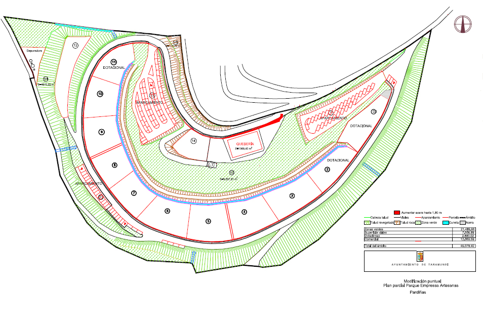La superficie de cada una de las 15 parcelas del polígono, con la indicación del uso al que están destinadas se indican en la siguiente tabla. El croquis de situación de las mismas en el polígono se puede ver en el croquis que se incluye más abajo.
